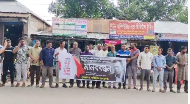 সারাদেশে সাংবাদিকদের ওপর হামলা, মামলা, নির্যাতন এবং গাজীপুরে সাংবাদিক আসাদুজ্জামান তুহিনকে প্রকাশ্যে হত্যার প্রতিবাদে গাইবান্ধার সুন্দরগঞ্জে মানববন্ধন অনুষ্ঠিত হয়েছে।
